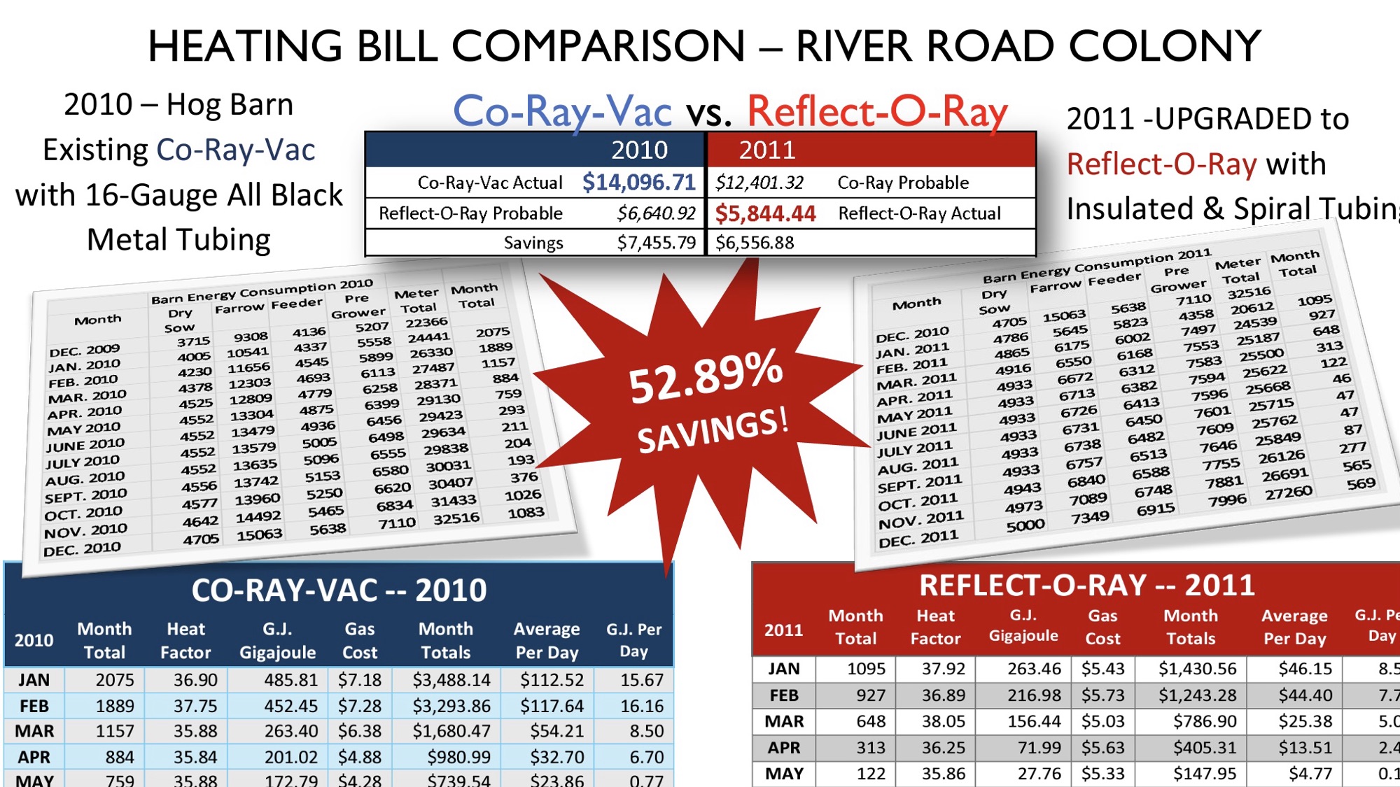 Up until the end of 2010, River Road Colony utilized the Co-Ray-Vac system in their hog barns. Although this system was capable of adequately heating the barns, it was burdened with inefficiencies due to its reliance on traditional heavy 16-gauge black metal tubing throughout its entire structure. In pursuit of a more efficient alternative, the colony turned to the Reflect-O-Ray system. Renowned for its patented 22-gauge aluminized steel alloy spiral tubing, Reflect-O-Ray not only offered quicker start-up times but also ensured more uniform temperature distribution within the barns. This advancement significantly enhanced heat transfer and reduced energy consumption, marking a substantial improvement in heating efficiency.